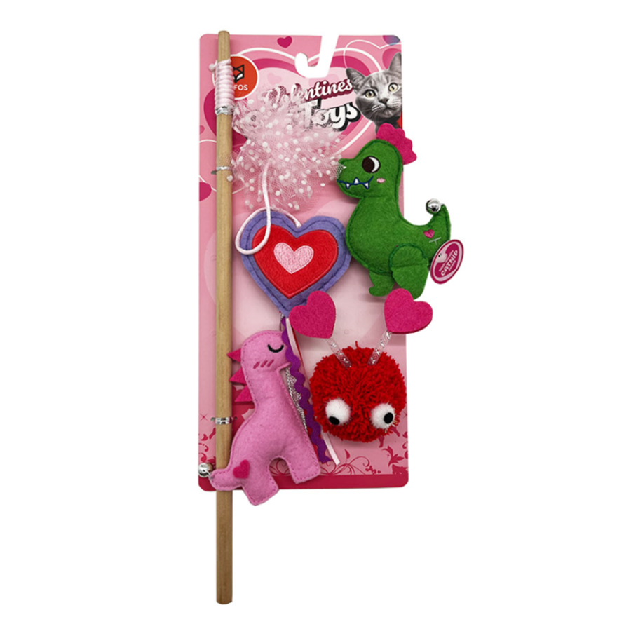6-piece set: Includes a wand with a hanging heart, two loving dinosaurs, two jingling balls, and an adorable red pompom.