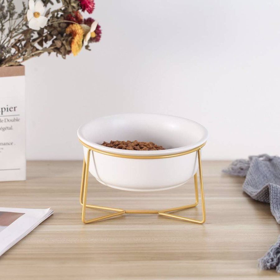 White Ceramic Bowl with a gold stand of 800ml, perfect for providing a comfortable and stylish feeding experience for your cat. The fixed inclination of the bowl helps improve posture during feeding, facilitating digestion and promoting your cat's well-being.