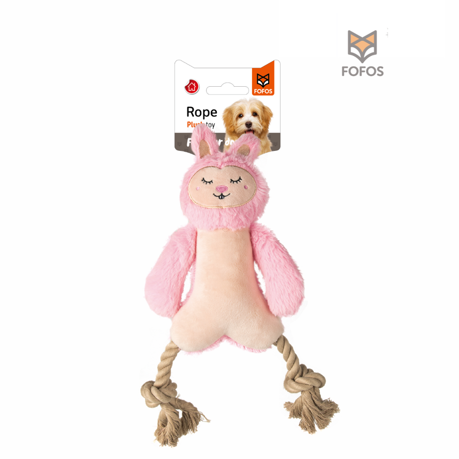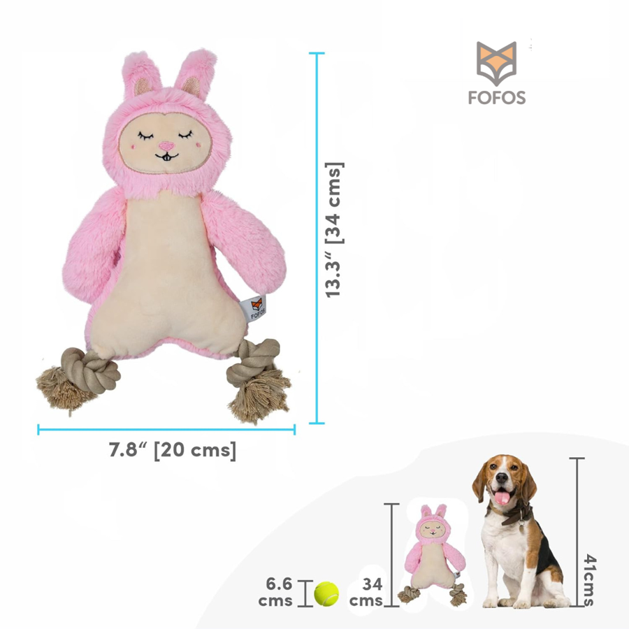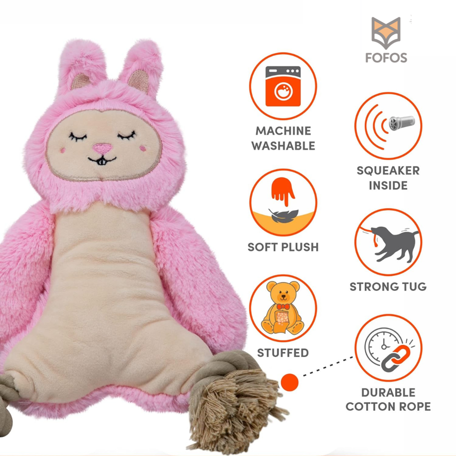 El FOFOS Conejo de Peluche con Cuerda ofrece horas de diversión a tu perro. Su cuerpo de peluche suave y sus resistentes patas de cuerda de algodón lo hacen ideal para juegos interactivos y para masticar. El chirriador escondido en su interior mantiene a tu perro interesado, fomentando la estimulación física y mental.