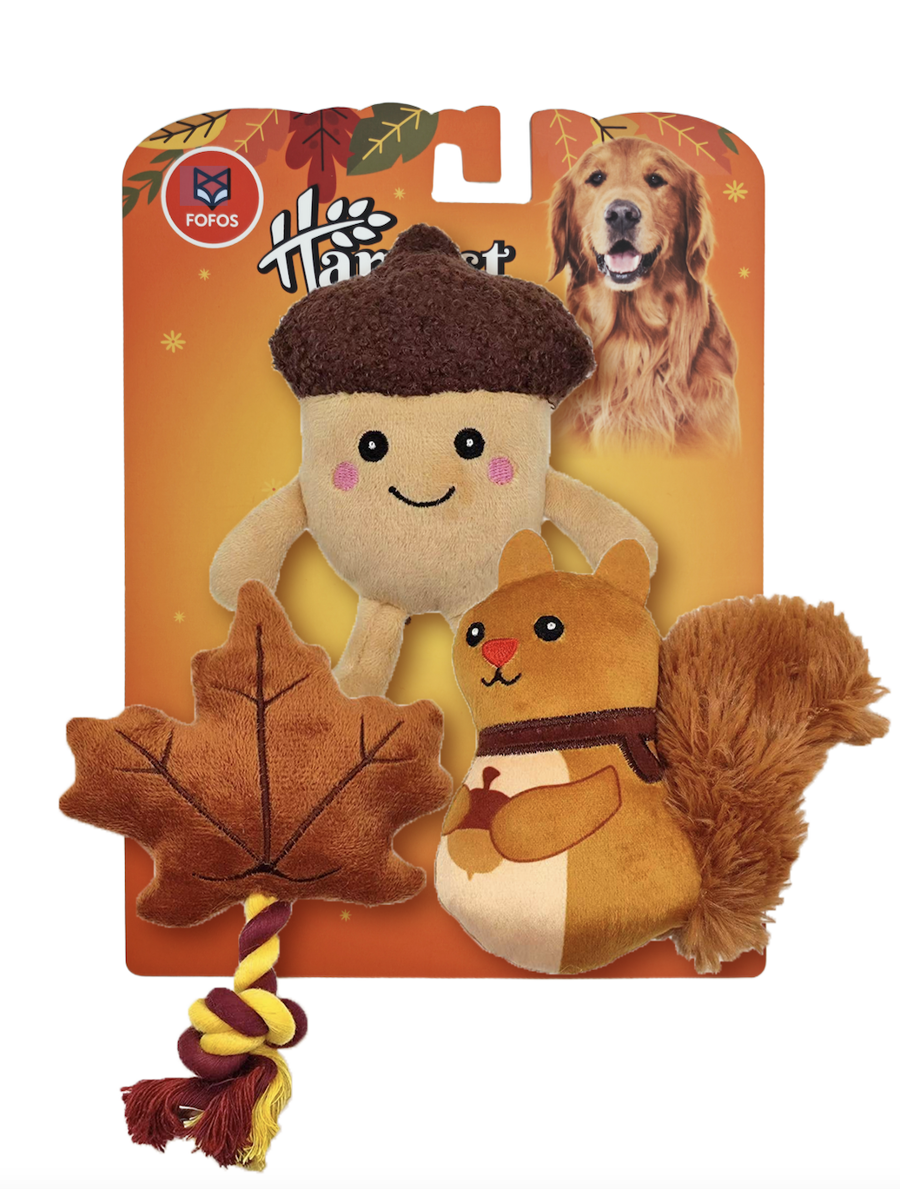 El FOFOS Pack de Otoño – 3 Juguetes es el conjunto ideal para brindar diversión y confort a tu perro durante la estación más acogedora del año. Cada pack incluye tres peluches suaves, resistentes y temáticos, diseñados para estimular el juego, morder y abrazar. Perfecto para perros de todas las edades que disfrutan explorando e interactuando con juguetes seguros y de calidad.