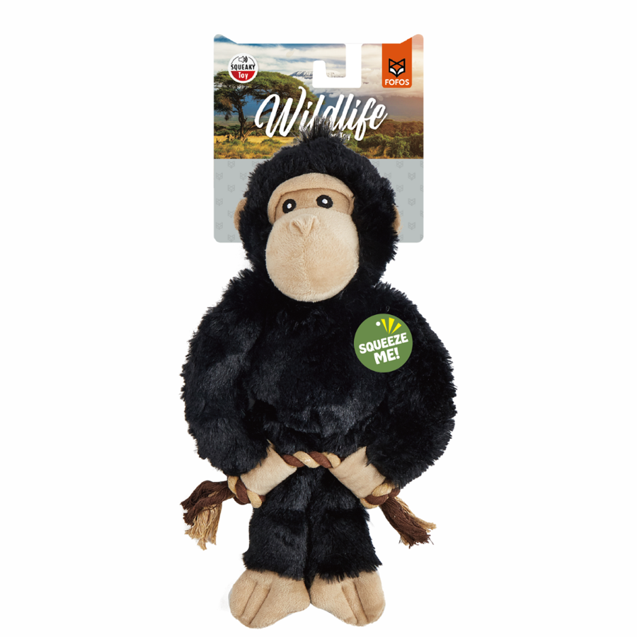 El Gorila FOFOS | Vida Salvaje mide 30,5 cm y está diseñado para divertir y acompañar a tu perro. Tiene una textura suave, un sonido interno que estimula el juego y cuerdas resistentes en las manos para tirar o morder. Ideal tanto para juegos activos como para momentos de relax.