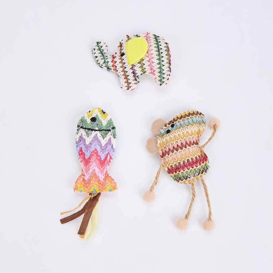 • 3 juguetes con forma de elefante, pez y ratón, con diseño artesanal