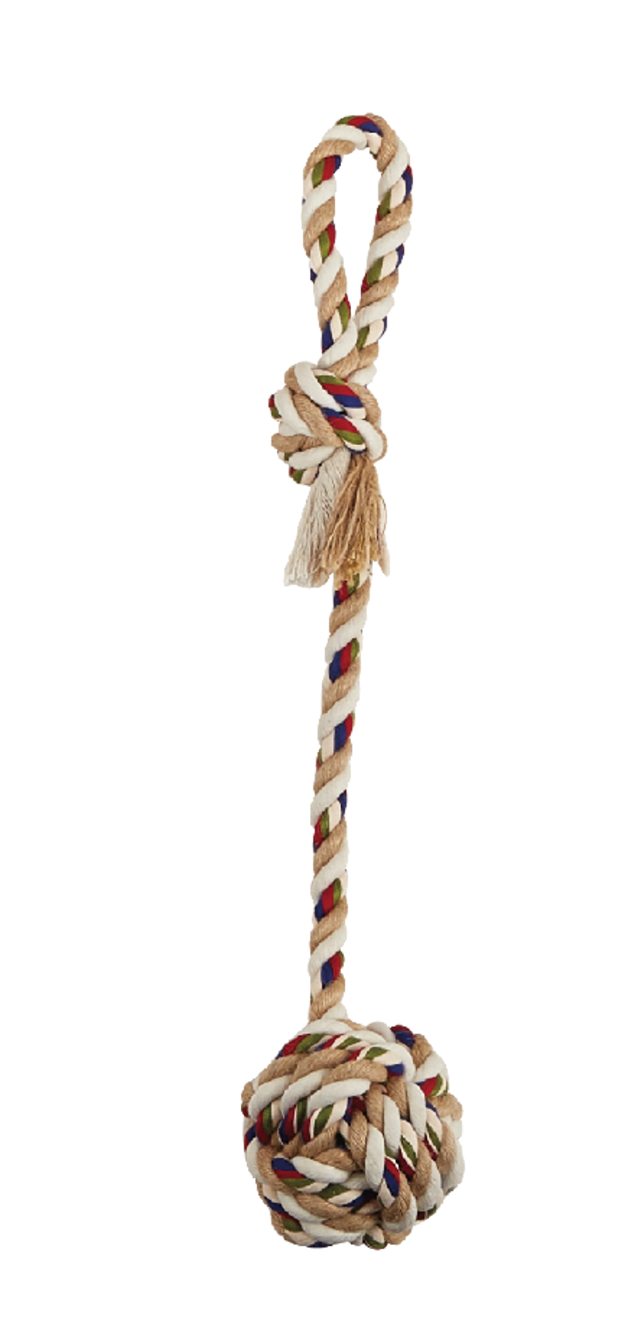 A bola entrançada e a pega ajudam a manter o brinquedo seguro e fácil de usar.