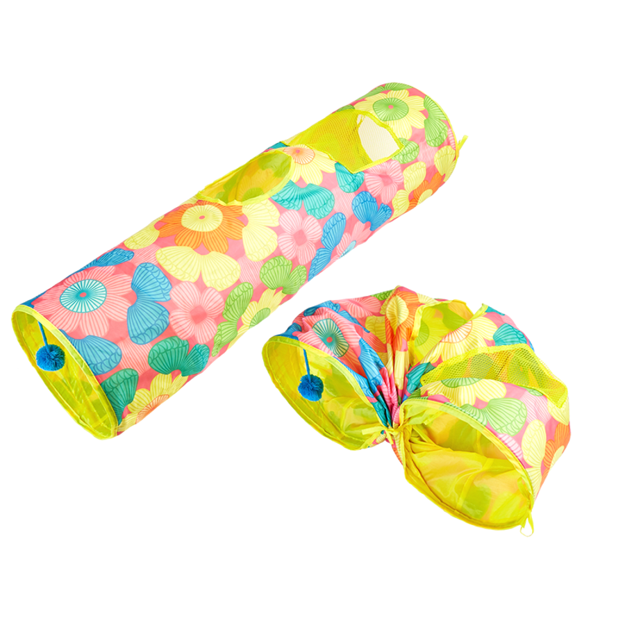 O Túnel Interativo FOFOS é a escolha perfeita para manter o seu gato entretido e ativo. Com um design dobrável e portátil, este túnel é fácil de guardar ou transportar. O seu padrão colorido atrai a atenção e o brinquedo com pompom na entrada aumenta a diversão. Ideal para brincadeiras de perseguição, esconder e surpreender, este túnel estimula o instinto natural do seu gato.