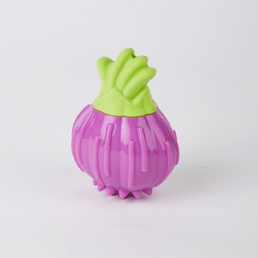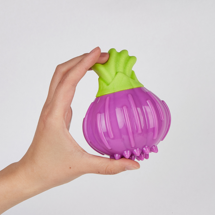 Brinquedo resistente em formato de cebola, perfeito para cães que adoram roer. Com textura para massajar gengivas e um apito interno para maior diversão.