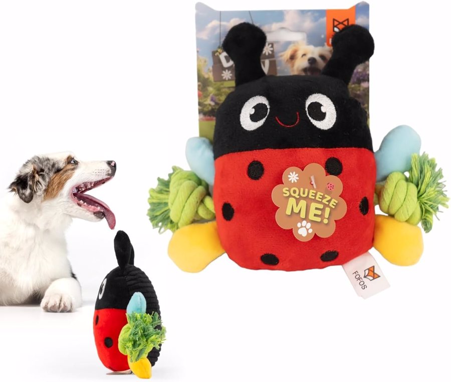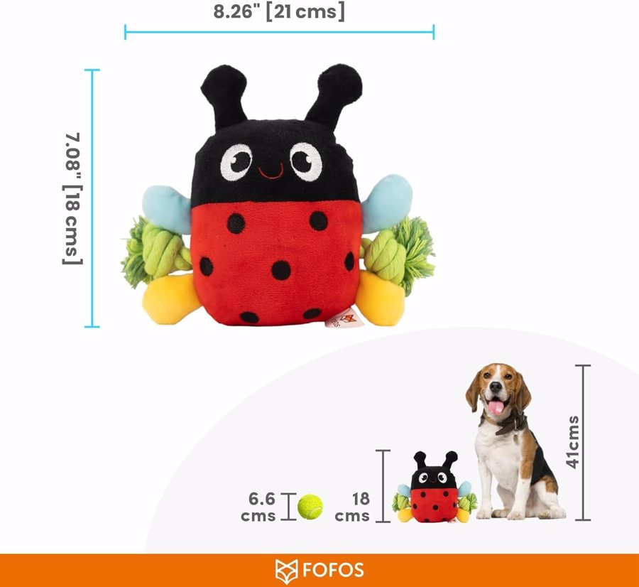 O brinquedo de peluche FOFOS Joaninha é perfeito para cães curiosos e brincalhões. Com um corpo colorido e suave, este brinquedo combina apito interior com cordas laterais resistentes, ideais para puxar ou mastigar. A sua textura macia torna-o também num excelente companheiro de sestas. Estimula o instinto natural de brincar, morder e interagir, sendo ideal para cães de pequeno e médio porte.