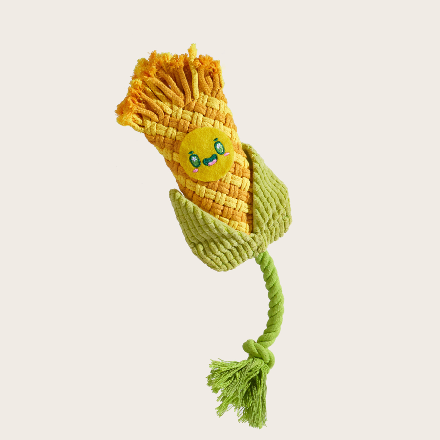 Colorido, divertido e funcional! Um brinquedo em forma de milho, com corda resistente e som apelativo — ideal para cães cheios de energia.